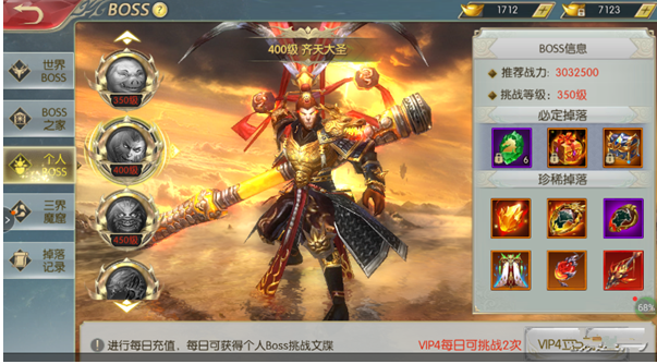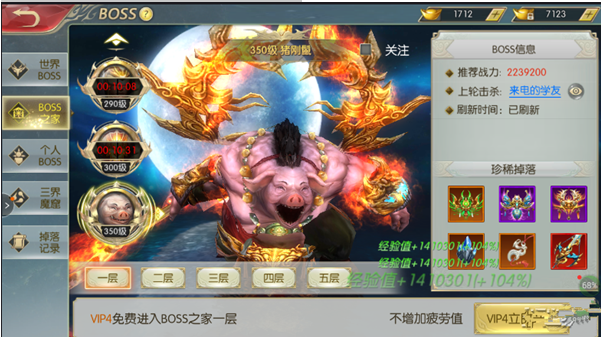 嫌弃世界BOSS疲劳度限制?那么BOSS之家就很推荐哦,但是BOSS之家需要VIP4才能进入哦。相比起世界BOSS,BOSS之家的掉落也是很丰富的,高阶装备快来我怀里~