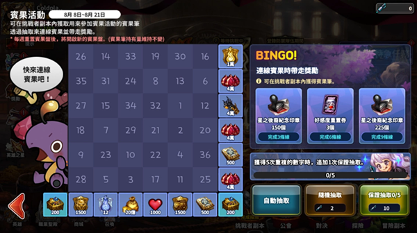 深受玩家喜爱的宾果盘抽奖再度登场! 每当连线时即可获得连线奖励,重复抽出5次一样的数字时,再增加1次保证抽取次数。 快去试试手气吧!
