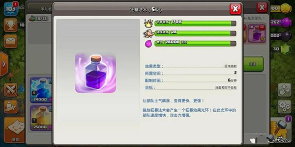 狂暴法术也是必须满级的法术之一,这个法术的用处非常广,不管你是空中部队还是地面部队,对狂暴法术的需求是一样的,首先天女得带一瓶,攻城器械想要爆本也得带一瓶,一次部落战带上两瓶狂暴法术是最低的标准,所以小伙伴们一定要认清狂暴法术的重要性。