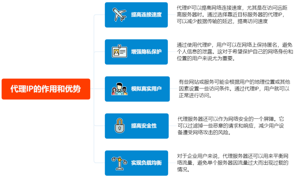 代理IP 的优势有很多,包括但不限于提供提高网络连接速度、以及增强安全性和隐私保护、模拟真实用户、提高安全性、实现负载均衡等等。