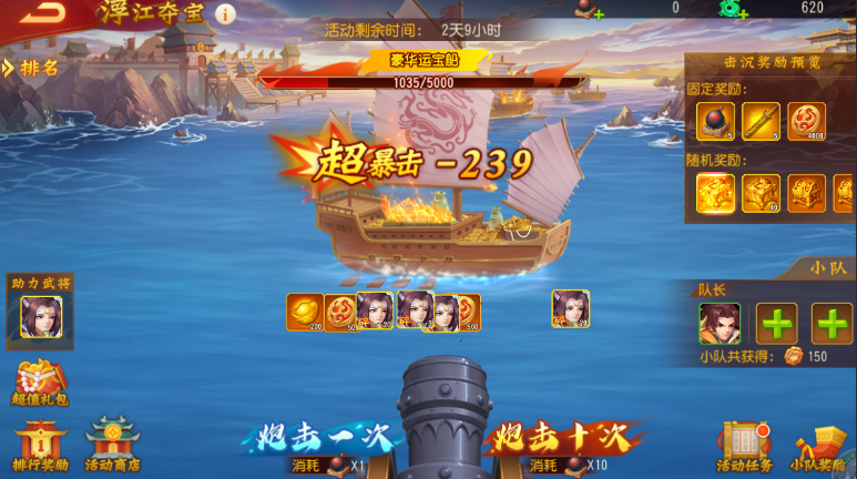 4、主公每次开炮都能对运宝船造成一定伤害,该伤害分为普通攻击、暴击与超暴击三种,普通攻击能够造成约120点伤害,暴击能够造成约180点伤害,超暴击能够造成约240点伤害。